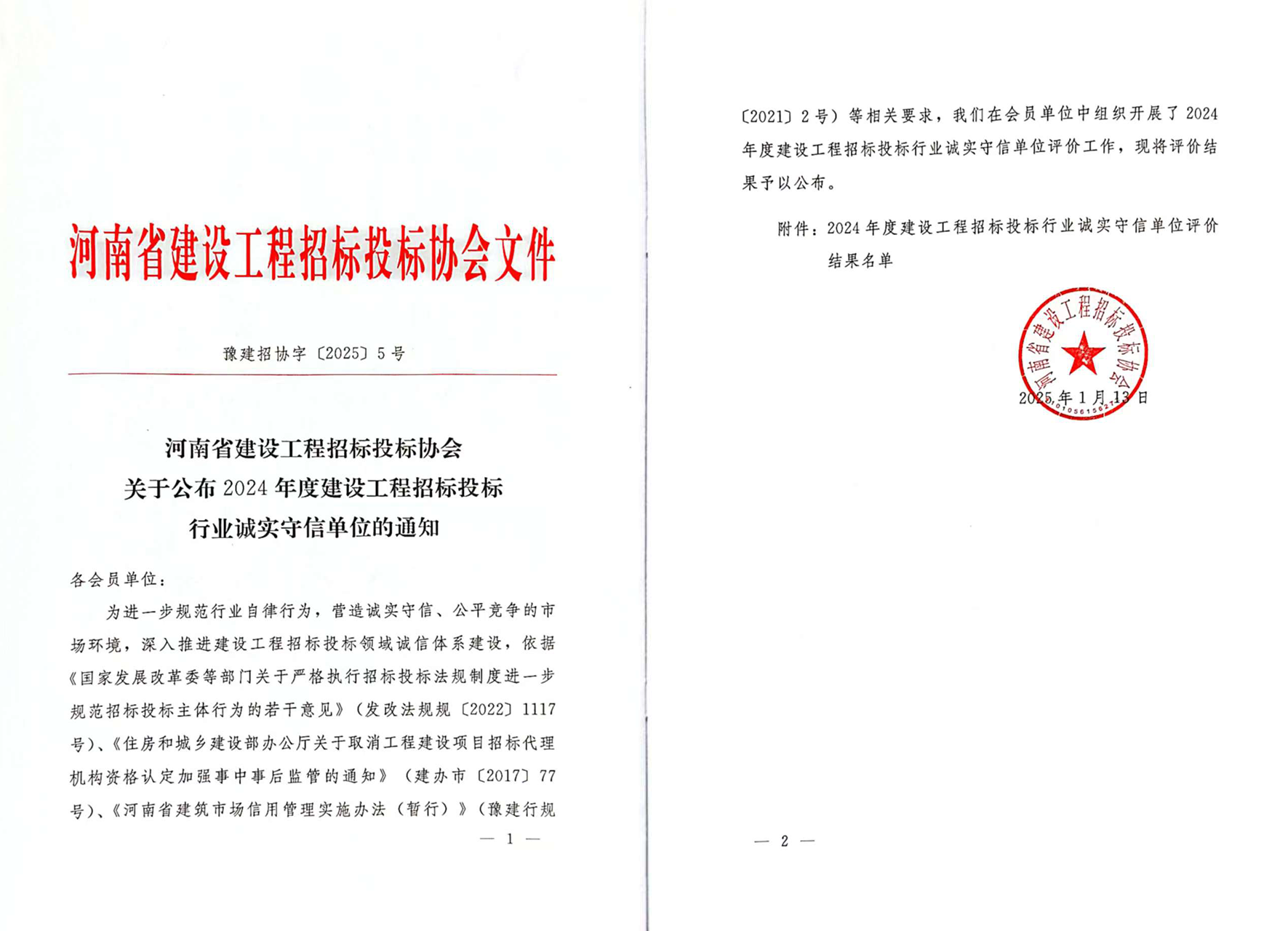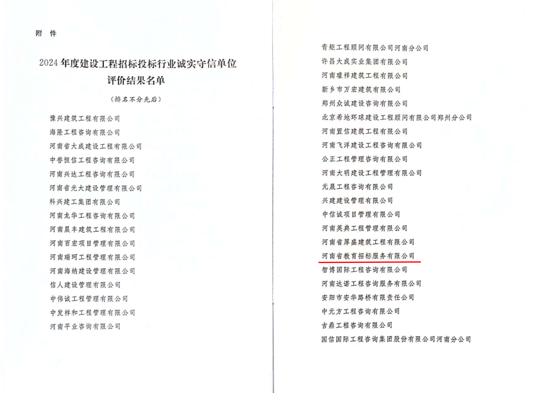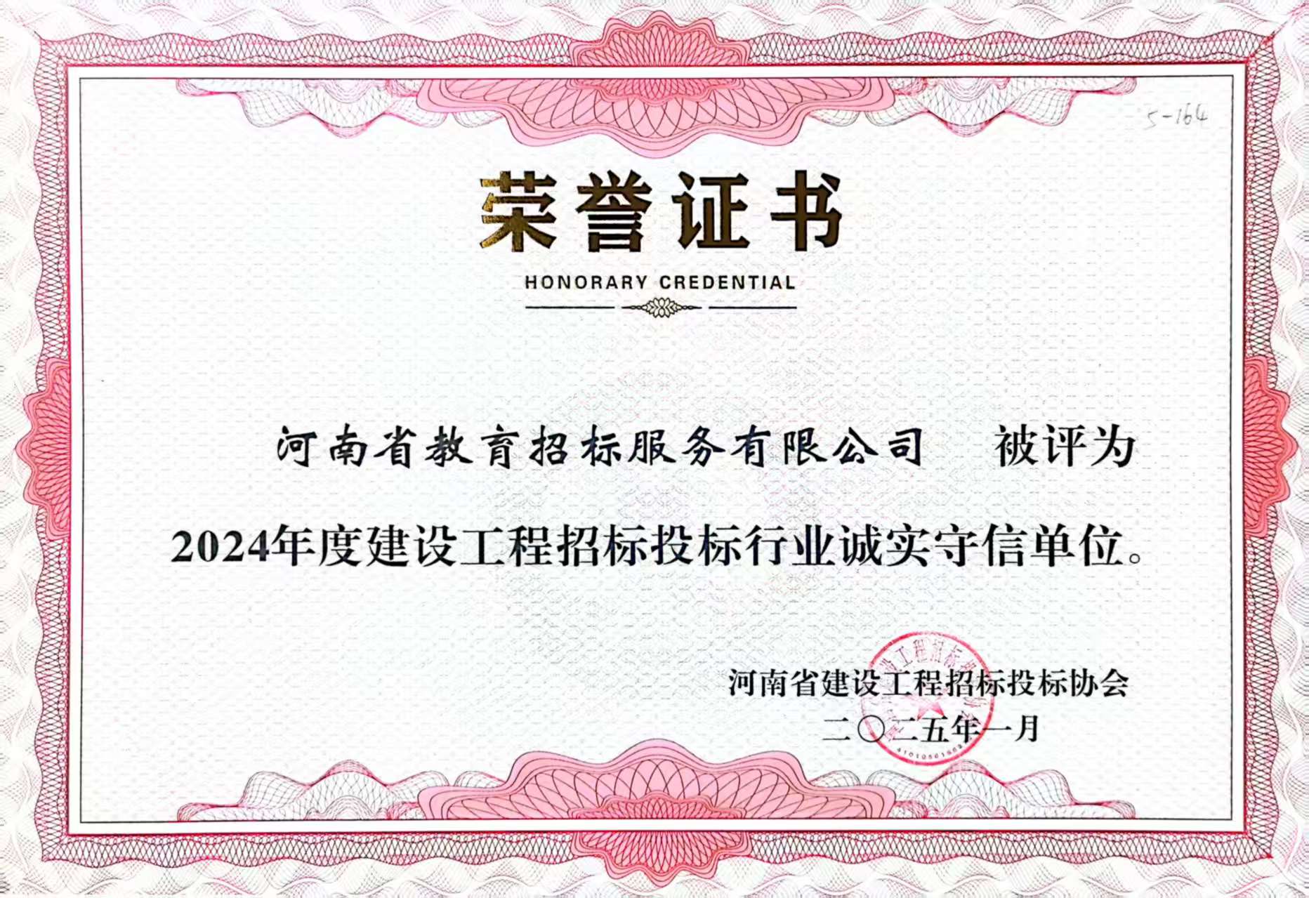 2024年度建設(shè)工程招標(biāo)投標(biāo)行業(yè)誠實(shí)守信單位評價(jià)活動中,河南省教育招標(biāo)服務(wù)有限公司憑借在商業(yè)活動中始終堅(jiān)守誠信原則,贏得了良好的口碑與業(yè)界認(rèn)可,榮獲“2024年度誠實(shí)守信單位”稱號。
